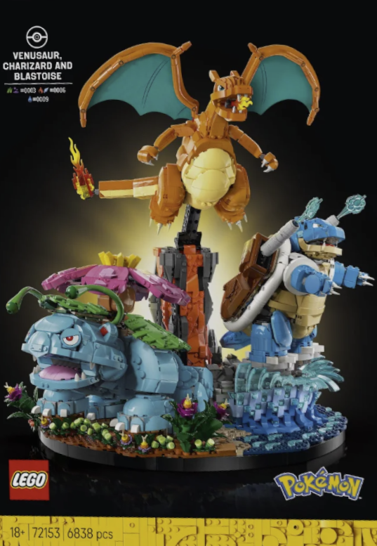 Die Altersempfehlung liegt bei 18+ Jahre. Das Set LEGO® keiner Bisaflor, Glurak und Turtok ist in 02/2026 erschienen.